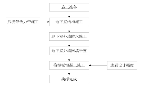 基坑换撑是指通过结构构件将基坑围护结构的荷载从内支撑转换至地下室主体结构,并进行地下室外墙土方回填。常见的换撑结构有换撑板、换撑梁。基坑换撑完成后,可拆除内支撑,基坑换撑施工内容包括换撑结构施工、后浇带等施工缝传力带施工、地下室侧墙土方回填。