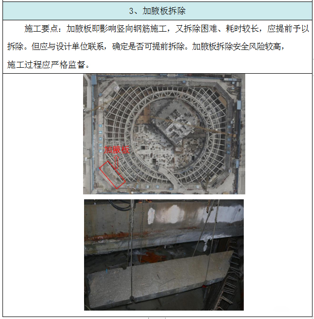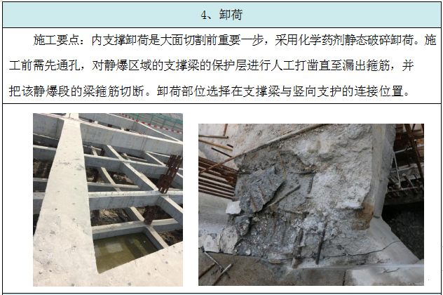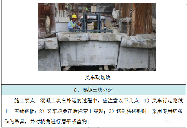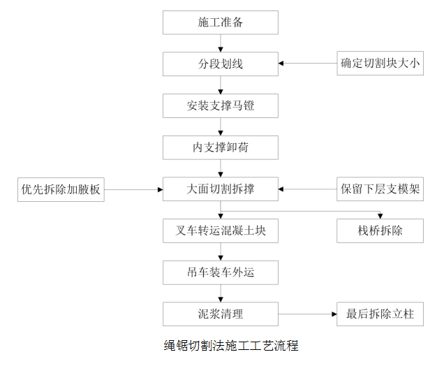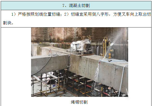 绳锯切割是指采用金刚砂链条将钢筋混凝土内支撑梁切割成块状,然后再向外运输,基本适用于所有钢筋混凝土内支撑,部分内支撑在基坑角部或中部位置有加腋板,加腋板一般都会挡住墙柱钢筋,造成钢筋无法施工,可提前拆除。