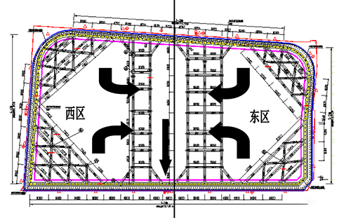 考虑主楼分布特点、基坑形状及场地施工交通状况,采用分区拆除的方法,即先施工东区,后施工西区。